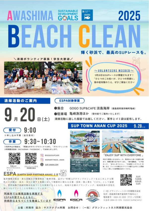 ビーチクリーンを実施します! View Larger Image 「阿南SUPタウンプロジェクト」では、阿南市内の事業者(エスパ)と関係人口(エスカ)が協働して、本市の豊かな海洋環境を保全することを目的に、清掃活動を実施しています。 この度、次のとおりビーチクリーンを実施します! どなたでもご参加いただけますので、お気軽にご参加ください。 ■開 催 日 令和7年9月20日(土) ■受付開始 午前9時 ※事前申込不要(当日受付します) ■作業時間 午前9時30分~午前10時30分 ■清掃場所 淡島海岸(阿南市畭町亀崎) イベントチラシ sup_anan2025-09-03T11:56:20+09:00